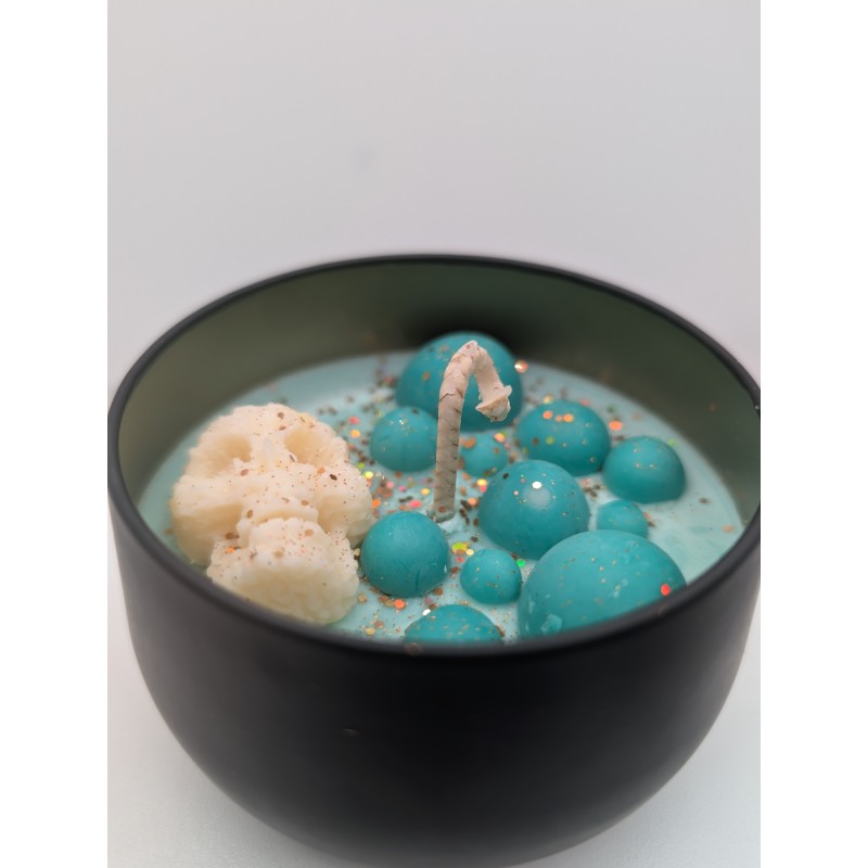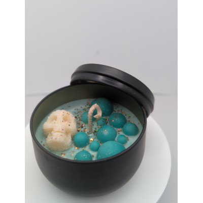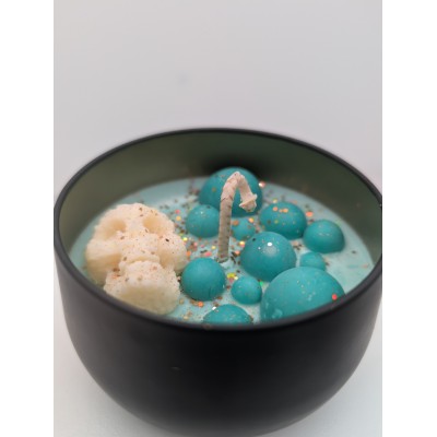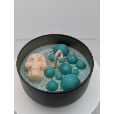 Bougie "Les folies de Nicole" Potion magique.Plongez dans l'univers d'halloween avec cette bougie artisanale coulée a la main dans son contenant sombre et élégant.Elle est décorée de petites sphères vert émeraude et d'un crâne en cire , rappelant les bulles d'un chaudron enchanté.