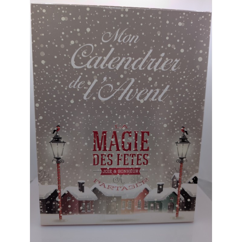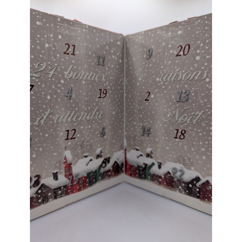 Calendrier de l'avent avzc chaque jour un tartinable de 35g ou une confiserie différentes (calisson, chocolat,pâte de fruits,nougat), miel ou thés et infusions.